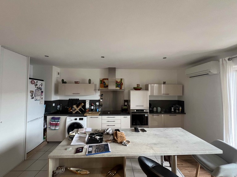 Salon – Séjour orienté Sud avec cuisine ouverte et équipée.
